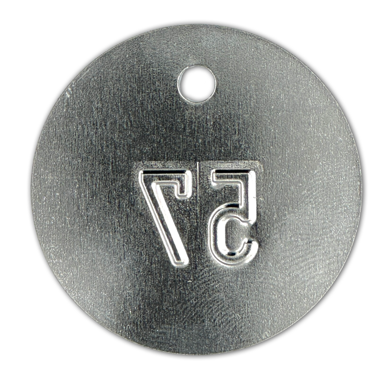 La placa de hojalata estampada, con unas dimensiones de Ø 45 x 0,2 mm, es ideal para diversas aplicaciones de identificación. Cuenta con un orificio de 5 mm en la parte superior y una distancia entre el borde y el centro del orificio (R-LM) de 8 mm. Los números están estampados en relieve con una altura de 13 mm, lo que garantiza una identificación clara y duradera. Perfecta para su uso en entornos industriales o para el marcado de máquinas y herramientas.